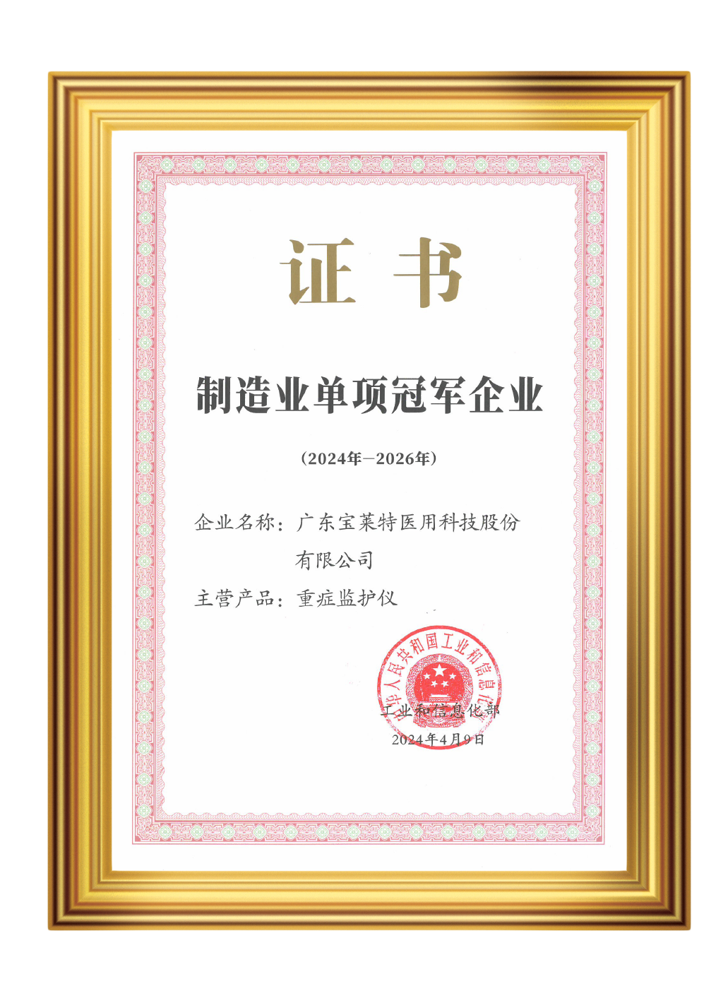 作為國內醫(yī)療器械老牌企業(yè),多年來,寶萊特用長期主義給出了新質生產力的“寶萊特答案”。今年4月,廣東省工業(yè)和信息化廳公示了第八批國家級制造業(yè)單項冠軍企業(yè)名單,寶萊特榮獲國家級制造業(yè)單項冠軍企業(yè)獎項。